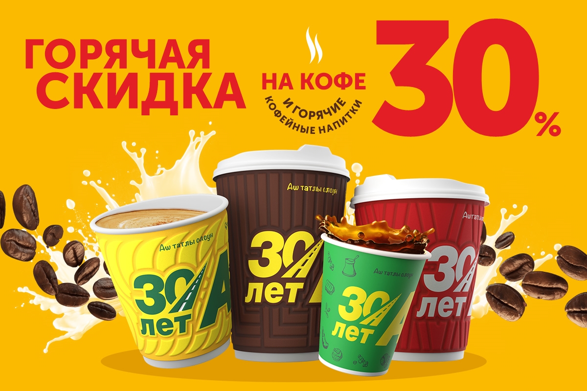 При заправке от 25 литров любым видом топлива получайте скидку 30% на любые горячие кофейные напитки.